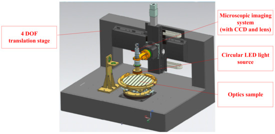 The light source and camera were mounted onto a four-degree-of-freedom (4-DOF) translation stage to capture sub-aperture images. The 4-DOF translation stage made it possible to inspect both flat surfaces and sphere optical surfaces [23]. The object distance must be controlled precisely during the whole scanning period, to ensure the test surface within the depth-of-field of the imaging system.