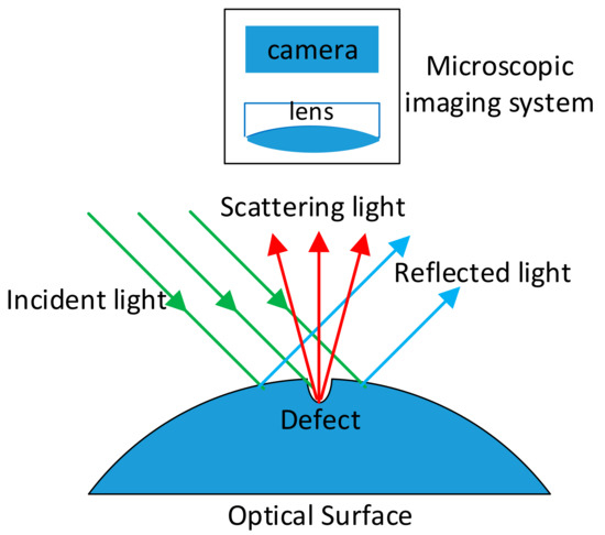 The schematic setup of the inspection system is shown in Figure 1. Annular spaced LEDs were used as the light source with a specific incidence angle onto the surface. As shown in Figure 2, if defects existed in the illuminated area, part of the incident light would be scattered into the microscopic imaging system (with camera and lens), which was placed on top of the tested surface. The defects would then be imaged by the imaging system, owing to the scattered light [20,21]. When no defects existed in the illuminated area, no incident light were reflected into the camera. Therefore, the output of the digital camera remained as dark images. This “dark-field” imaging system was able to achieve high sensitivity compared with other imaging methods [15,22].