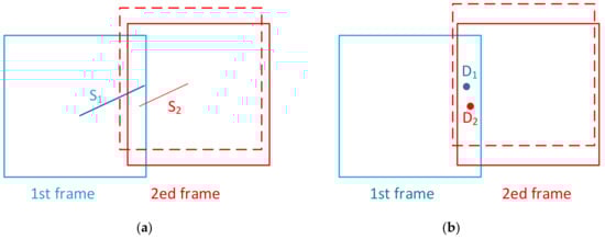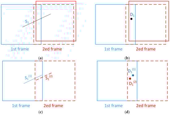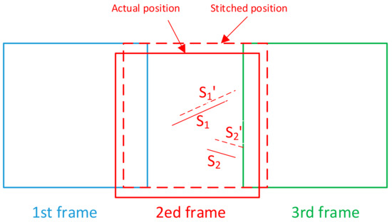 As shown in Figure 4a, there is a long run-through scratch S1 in the overlapping area. The actual position of the second frame is shown as a red solid line, while the nominal position for stitching is shown as a red dotted line. Due to the positioning error, there is a deviation between the two positions. After stitching, one scratch becomes two scratches, S1(1) and S1(2), as shown in Figure 4c. For digs, because of the existence of positioning error, one dig D1 in Figure 4b is distinguished as two digs, D1(1) and D1(2), after nominal position stitching, as shown in Figure 4d. For template-matching stitching with sampling order, the mismatch is detailed described in [14].