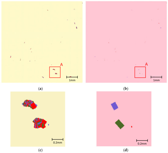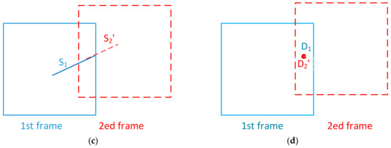 As shown in Figure 5a, there is a scratch in the first frame and another scratch in the second frame. The angles of the two scratches are basically the same, but there is a certain distance between them. The actual position of the second frame is shown as a red solid, while the position for template-based stitching is shown as a red dotted line. Two scratches in the overlapping areas, S1 and S2, are treated as a long run-through scratch S’, as shown in Figure 5c. For digs, two different digs, D1 and D2 in Figure 5b in the overlapping area, are stitched into one single dig D’ in Figure 5d.