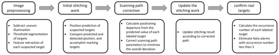 Image preprocessing should be firstly carried out, accomplishing target extraction from the original sub-apertures and the feature extraction of these suspected targets. Secondly, the initial stitching work should be performed, marking relevant suspected targets as the same defects. In this initial stitching work, the deviation tolerance of predicted position and actual position should be adequately larger due to the existence of both random positioning error of translation stage and the scanning path deviation. Thirdly, the scanning path compensation should be accomplished. Scanning path parameters were corrected according to the measurement of real scanning path accomplished by the inspection system. Then, the stitching work was updated according to the corrected scanning path parameters but with a smaller deviation tolerance between predicted position and actual position for each target. The deviation tolerance was estimated only by the random positioning errors of the translation stage. Finally, a process of target confirming was performed, eliminating false targets extracted in the former process.