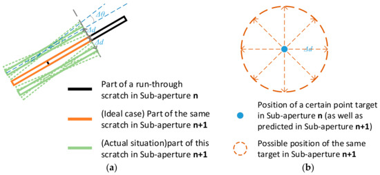 Description of mismatches for scratch and digs situation. (a) Mismatch of long run-through scratches between consecutive sub-apertures; (b) Possible dislocation of the same point targets between consecutive sub-apertures.