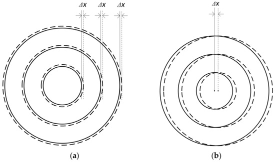 Figure 11. Types of scanning errors. (a) The first kind of scanning error, homogeneous radius error caused by the deviation of the starting position; (b) The second kind of scanning error, center shift between the planned and actual scanning path. - The centers of scanning circles do not coincide with the rotation center of the tested surface, as shown in Figure 11b. Compared with the ideal scanning path, the actual position of every sub-aperture departs from its nominal position.