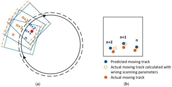 The predicted coordinates () are calculated from specific scanning path parameters. If these parameters largely deviate from the actual scanning path, the predicted coordinates of targets also largely deviate from the real positions where targets appear on sub-apertures, as shown in Figure 12. On the contrary, if the scanning path parameters used for stitching sub-apertures are close to real scanning parameters, the deviation tends to be negligible. Therefore, it is possible to correct the scanning path parameters by making efforts to minimize the sum of all targets’ deviations, which can be expressed as: