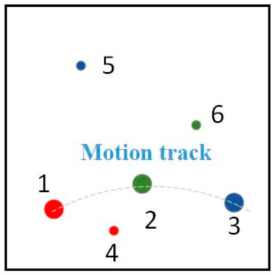 Our proposed method has potential for helping to improve the performance of weak defects detection while maintaining low false-alarm rates. As discussed above, each real defect appears in at least three consecutive sub-apertures, with a motion track coinciding with sub-aperture scanning path. False targets, however, appear at random positions in each sub-aperture. Therefore, we are able to make a distinction between real targets and false alarms by the occurrence number of each targets. As shown in Figure 14, red spots, green spots, and blue spots are the transform projections of suspected targets from sub-apertures n, n + 1, and n + 2 respectively. The targets 1, 2, 3 appear as a motion track in the field of view, while the other three targets appear at random positions. We are able to make the judgments according to this appearance. The targets with occurrence less than 3 are treated as false alarms and are eliminated.
