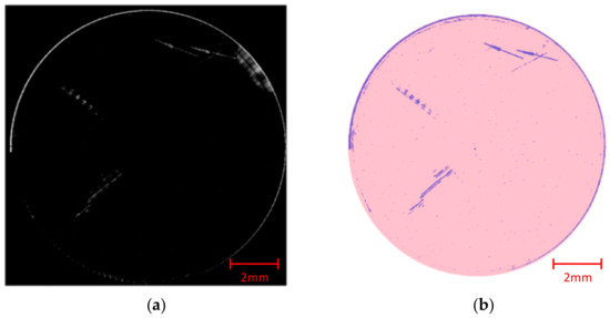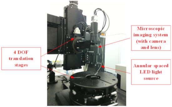 The experiment system is shown in Figure 15 and described in Section 2.1. The dark-field defect inspection system mainly included 4-DOF translation stage, annular spaced LED light source, and microscopic imaging system. The capture speed of the camera can reach 75 frames per second with image size of 2048 × 2048 in pixels. The magnification of the Edmund telecentric lens was 1.7× and the depth of field was ±0.18 mm at f/10. The field of view of the microscopic imaging system was 3 × 3 mm. The light source was a 460 nm annular-based LED with the incident angle of 45°. The accuracy of measurement on size and position was about 1.5 microns.