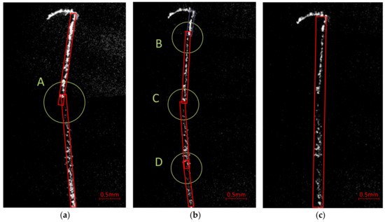 A long run-through scratch mismatch correction work is described as the second case. The following three images shown in Figure 18 illustrate three different situations inspecting a certain surface scratch. For the better description and visual presentation of this case, both original images and the feature MBR of scratches are present. The image in Figure 18a is composed of two adjacent sub-apertures, with a small overlapping area in accordance with the scanning strategy in conventional stitching methods. A serious mismatch can found at position “A” in the middle of this scratch. Increasing the overlapping area as required by our proposed method (at least three appearances for each target), the same scratch is composed of four sub-apertures in Figure 18b. Mismatches still exist in overlapping areas “B”, “C”, and “D” but are smaller than that of Figure 18a. The mismatch became smaller because of the smaller cumulative deviation between adjacent sub-apertures, as space between sub-apertures decreased.