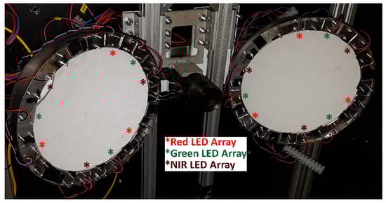Three main components are used for crop and weed identification: a PC, RGB camera, and lighting rig; a 12 V lead-acid battery powers the system in conjunction with an inverter to supply the PC; LED arrays, 650 (red), 850 (NIR), and 525 nm (green) (Justar Electronic Technology Co. LTD). 5 × 5 arrays at 525–530 nm, 650 nm, 850 nm, 25 W, 1.75 A are used for illumination.