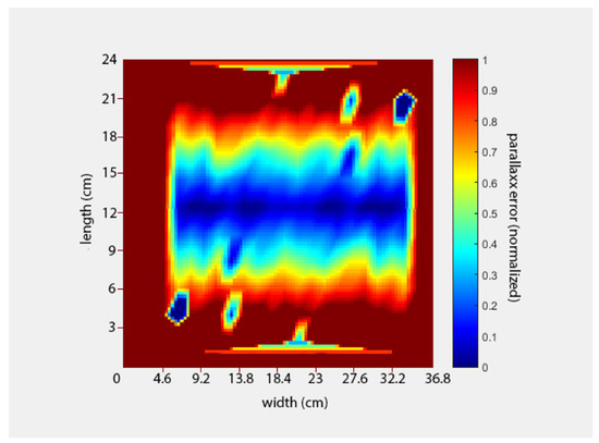 In order to image a field efficiently at high speed, it is essential that each frame captures the largest feasible area while maintaining sufficient detail to accurately identify and locate small plants. However, where plants are not located directly below the camera, variations in their height can result in an inaccurate determination of their position due to parallax error. In our system, the usable frame area (assuming a parallax error of less than 5% is acceptable) is approximately a 19% slice across the centre (Figure 5).