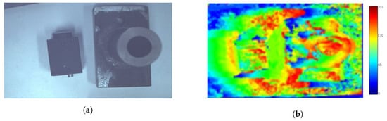 Tests were carried out to verify the reliability of the algorithm using objects of known height imaged twice with 2.1 cm camera displacement between images (chosen from the 90 fps camera frame rate and target 5 km/h system speed). The item on the left in Figure 6a is 2.5 cm tall; the object on the right is 3.5 cm tall at its lowest point and 11 cm at its highest. A height disparity map was produced from these images (Figure 6b), which shows significant error in the height estimation algorithm. The error was attributed to the small number of features, and thus, low spatial frequency of the image. Given that neighbouring pixels had very similar values, the algorithm was not able to accurately calculate the pixel shift.