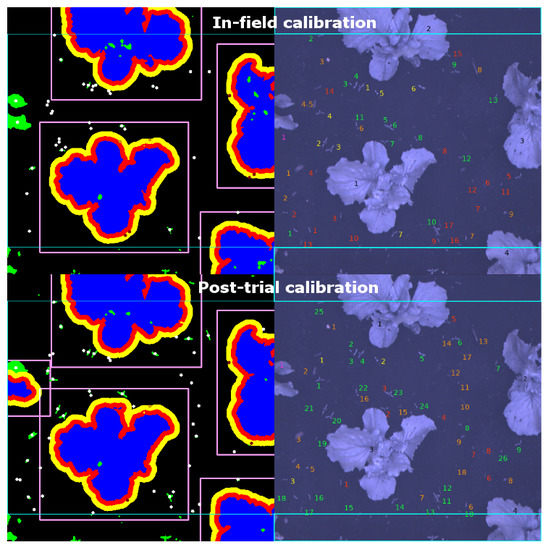 The in-field calibration files were also saved to reproduce the processed images after the trial; there were two files, one used for field 1 and part of field 2, the other for the remainder of field 2 and field 3. A random sample of 50 images was considered for further analysis. Each of the raw images was evaluated, and weeds and crops were identified by eye. This was then compared to the processed images to identify which plants had been correctly identified and where false negatives and positives had occurred according to the colour code described in Table 3. The process was completed first with the trial calibration and then with the post-trial calibration to establish the limitations of the calibration process and the capabilities of the system with optimal calibration (Figure 9).