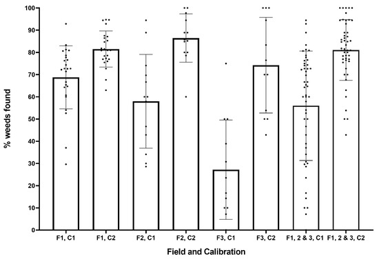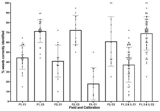 Proportion of weeds correctly identified for each field (F1–3) and calibration (C1, C2).