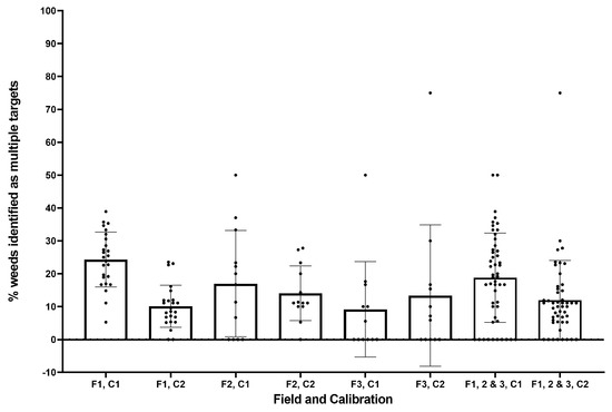 Proportion of weeds identified as multiple targets for each field (F1–3) and calibration (C1, C2).