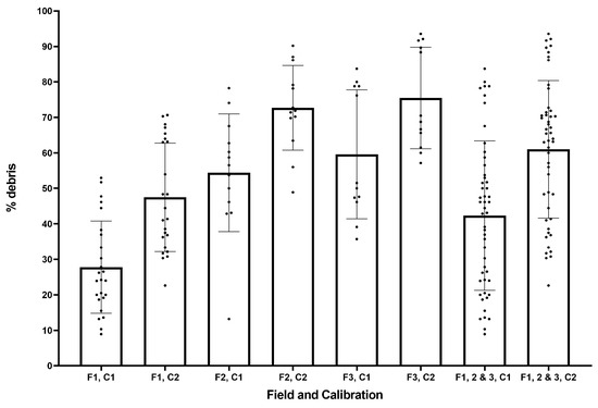 Field 1 had the lowest proportion of misidentified targets, due to its higher number of weeds/frame (average of 43 weeds/frame). The larger number of weeds, if average debris per image is approximately constant, results in an apparent reduction of debris identified. Where there is higher leaf coverage in an image, more of the debris will also be obscured. Finally, where there is a very high debris-to-weed ratio, it may result in a false peak in the histogram and error in identification.