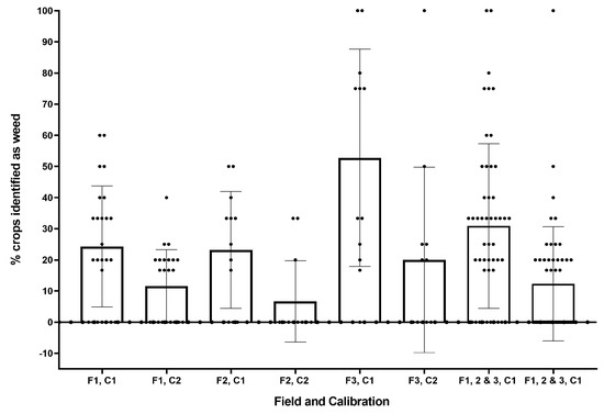 Percentage of crops misidentified for each field (F1-3) and calibration (C1, C2).