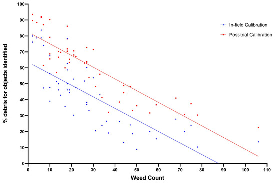 Field 3 had the smallest crops, and therefore, the fewest weeds/frame on average (nine) which may have resulted in the smaller peak in the histogram, a change in the threshold values, and a worse detection rate. Field 3 and part of field 2 also used a second, different calibration in-field due to the substantial change in crop size from those in field 1. This in-field calibration may have been less effective than that used for field 1. Post-trial calibration results are an improvement due to a process of trial and error not possible in-field and due to a lack of screen visibility in-field making it difficult to finely tune as required.