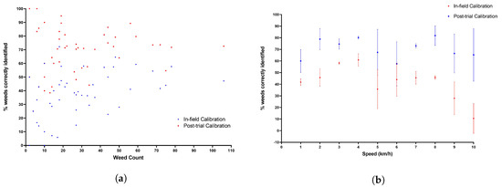 System weed identification capability with varying speed and weed count. (a) Percentage of correctly identified weeds versus total weed count. (b) Percentage of correctly identified weeds versus system speed in-field.
