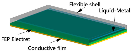 In this paper, we propose a flexible and stretchable energy harvester based on a gallium liquid-metal alloy, and this kind of alloy is composed of gallium and indium, and we bought them on the internet. The melting point of the alloy is different with different proportion of gallium and indium. The composition of the Ga-In alloy we used is 95Ga/5In, the melting point is 25 °C. In fact, the melting point of Ga-In alloy is between 25 and 30 °C. When the Ga is a solid state, it can not be stretched. Conductive film is a kind of film that the surface is full of Ag nano wires. The Ag nanowire film we used is purchased. Its substrate is PET, after the hardening treatment, the surface is pressed at high temperature to attach the nano silver wire to the substrate surface. In our design, we use 3D printing technology to print the mold, which the length is 102 mm, width is 52 mm, and thickness is 12 mm. We injected silicone rubber into the mold, took it out after the silicone rubber solidifies, got the silicone rubber mold with a cavity, inject the Ga-In alloy into the cavity, and then seal the alloy into the silicone rubber shell with silicone rubber. The version of the silicone rubber is Dragon Skin 10. The FEP film did not bond to the elastomer. They are independent of each other. The conductive film is a kind of film with Ag nano wires on its surface. We use double-sided adhesive to stick the conductive film and electret, but not the elastomer. The brand of double-sided adhesive is 3 M. The electrode in the solid state is wrapped in a dragon-skin silicone rubber shell to form a flexible and stretchable electrode. Then, it is bonded with fluorinated ethylene propylene (FEP) electret film and conductive film to form a flexible and stretchable energy harvester, as shown in Figure 1. The selected dragon-skin silicone rubber has a maximum strain approaching 900%, so it can provide enough deformation for the designed flexible electrode.
