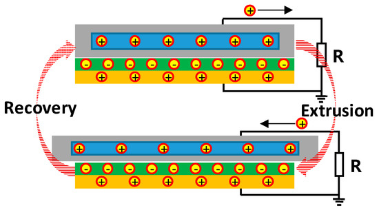 When the stretchable energy harvester is squeezed, the elastomer will be deformed. The experiment principle of this design is that the charged electret induces the charge on the upper and lower electrodes to form a charged capacitance of the electrode plate. By charging the distance between the two plates, the device will supply power. According to the principle of electrostatic induction, a current will be generated in the load, as shown in Figure 2.