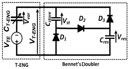 The minimum value () we measured was 2.8 pF, and the maximum value () was 15.8 pF, so . In addition, we used Bennet’s doubler circuit to increase the voltage and store the energy, as shown in Figure 3. For , the Bennet’s doubler works in exponential mode, while for , the Bennet’s doubler works in saturation mode [34]; thus, in this design, the doubler works in exponential mode.
