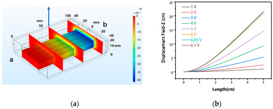 We fixed one end of the device, and the other end was used as the active end. By moving the active end and using COMSOL for simulation, the electric field distribution at different positions was obtained in Figure 4a. The voltage in the simulation was generated by moving different displacement at different sampling points of the device. In Figure 4b, the device moves in the direction of the blue arrow on the way. The abscissa of Figure 4b in the article shows the position of the sampling point from the fixed end (b) during the period, and the ordinate shows the displacement of the device along the vertical direction.