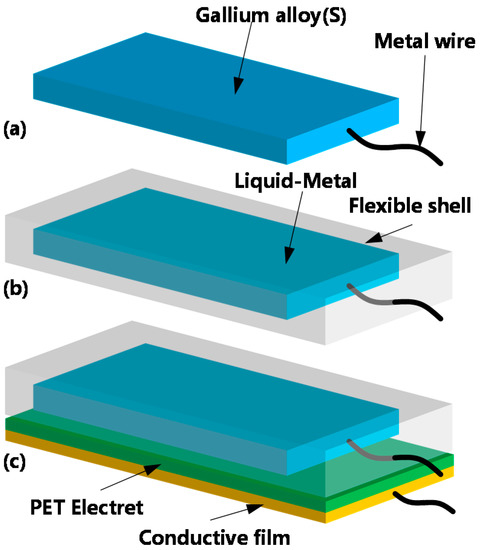The fabrication process of the designed energy harvester is shown in Figure 5. First, liquid gallium alloy was prepared from a solid-state electrode by the molding method and low-temperature curing. Simultaneously, metal wires were embedded in it, as shown in Figure 5a. Then, using dragon-skin silicone rubber for secondary molding, the solid-state electrode was wrapped in the silicone rubber, as shown in Figure 5b. Then, the electrode was heated to the melting point, and when the metal melted into liquid state, the Ga electrode became stretchable. Finally, the FEP electrode, conductive film and the silicone elastomer made up the whole device, as shown in Figure 5c. With this method, the liquid-metal embedded silicone elastomer could be easily obtained, and the pattern of liquid-metal electrodes could be easily realized.