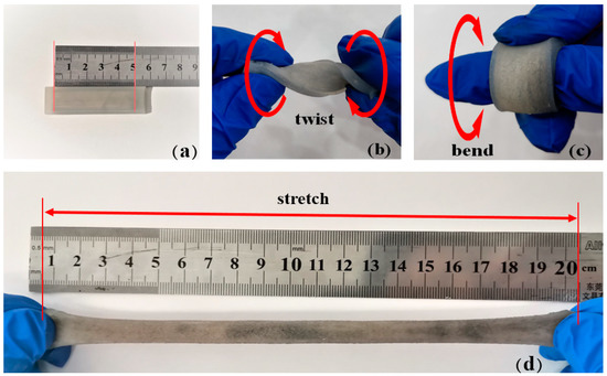 Liquid-metal embedded silicone elastomer has good flexibility and stretchability. (a) Fabricated liquid-metal embedded silicone elastomer; Twisting (b), bending (c), and stretching (d) of the fabricated liquid-metal embedded silicone elastomer.