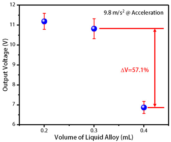 The open-circuit voltage (OCV) represents a voltage source’s full voltage. For the designed flexible and stretchable energy harvester, the OCV is mainly affected by three parameters: the liquid alloy content in the electrode, the acceleration generated by external extrusion, and the resistance of the external load. Therefore, in this part, the influence of the above three parameters on the energy output performance of the energy harvester was explored.