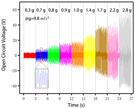 To analyze the influence of extrusion acceleration on the open-circuit voltage, the energy harvester containing 0.4 mL liquid alloy was placed on a vibratory table and externally loaded with a resistance of 200 MΩ. Different open-circuit voltages due to different extrusion accelerations are shown in Figure 9. As shown in the figure, with the increase of the extrusion acceleration, the open-circuit voltage increased significantly; when the acceleration was 0.3 gravity acceleration, the open-circuit voltage was approximately 5 V, and when the acceleration was 2.8 gravity acceleration, the open-circuit voltage increased to 60 V. Since the difference between different devices was only the difference of the volume of the liquid metal alloy, and the resistance of the liquid metal alloy could be ignored compared with the full device. What we used was the matching impedance of the resistance box, which is only a general range, and it cannot be very fine. 200 MΩ was the most impedance we got after testing. The enlarged part of the figure shows the details of the waveform.