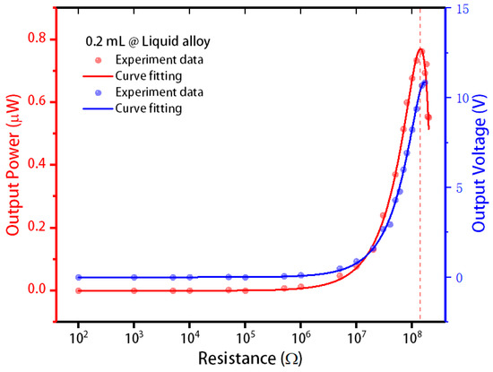 The test results are shown in Figure 10. As the external load increased, the output voltage of the energy harvester containing 0.2 mL of liquid alloy gradually increased, and the output power continued to increase slowly. When the load exceeded 10 MΩ, the output voltage and output power increased rapidly, and when the external load reached approximately 200 MΩ, the energy harvester’s output power reached the maximum value of 0.7 μW. Each output corresponded to a different resistance, and we calculated the power according to the following formula: .
