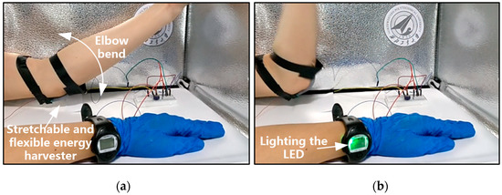 In this paper, to verify the effectiveness of the designed stretchable and flexible energy harvester, it was mounted on the elbow of a human body to harvest the energy produced by the bending of the elbow, as shown in Figure 11a. When the elbow was bent, the energy harvester would be squeezed and stretched; according to the working principle shown in Figure 2, the energy harvester converted elbow bending into electrical energy that is stored in a super capacitor. When the capacitor was connected to the watch, the LED in the watch would be lit, as shown in Figure 11b. If we did not use the peripheral circuit to store the generated energy, the LED lit up and went out with the motion. We stored the energy in the super capacitor through Bennet’s doubler circuit, and then used the super capacitor to discharge to achieve the continuous use.