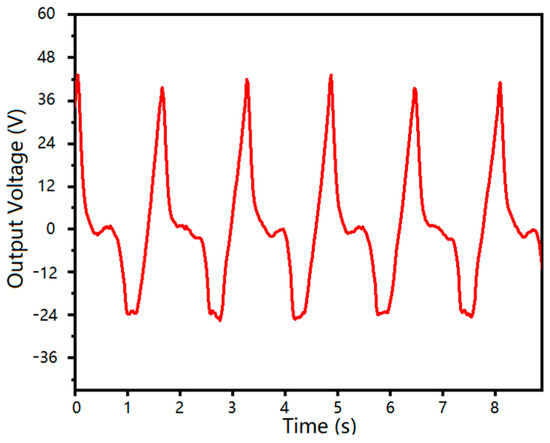 The output voltage and its repeatability of the stretchable and flexible energy harvester are shown in Figure 12. This is a test of the output performance of the generator tied to the arm. The abscissa is the motion frequency of the arm, and the ordinate is the output voltage of the device. It can be seen that the maximum voltage was about 43V and had good repeatability.