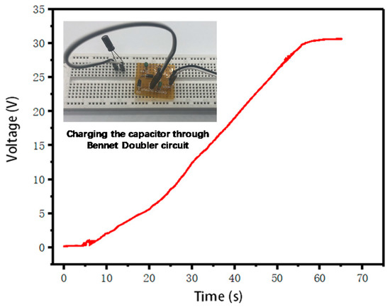 At present, energy storage is still an important issue. Our group, like others in the field of energy harvesting, used super capacitors for energy storage. We charged the supercapacitor through Bennet’s doubler circuit, and we used the 10 μF capacitor as the energy storage element, which could be filled to 31 V in 50 s, and the charging curve is shown in Figure 13.