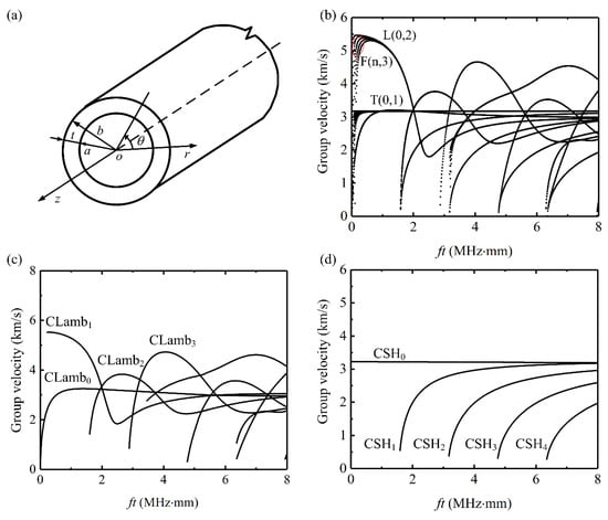 Group velocity dispersion curves of axial and circumferential guided waves in a steel pipe (outer diameter 720 mm, wall thicknesses 11 mm, Young’s modulus 210 GPa, density 7850 kg/m3 and Poisson’s ratio 0.33): (a) pipe axes configuration; (b) axial guided waves (F modes only shown up to 4th order); (c) circumferential Lamb (CLamb) waves and; (d) circumferential shear horizontal (CSH) waves.