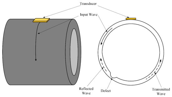 Figure 2 illustrates the basic idea of the circumferential guided-wave-based SHM approach [16]. Transducers are permanently installed on the pipe. The incident guided wave is excited in one direction around the circumference of a pipe and propagates across the defect. By examining the reflected wave and transmitted wave, the defect can be identified. Since the required inspection distance is relatively shorter than that of the axial guided wave, a higher frequency circumferential guided wave can be used to improve the sensitivity to defects. Obviously, circumferential guided-wave-based inspection is an appealing method for monitoring large-diameter pipes such as pressure vessels and oil tanks, in which a transducer array can be used. As for long range pipes, such as oil transporting pipelines, circumferential guided waves can be a good supplement to axial guided wave inspection. Long range pipes can be inspected by using a combination of axial and circumferential guided waves. For example, circumferential guided waves can be used to inspect the welding zones and pipe support regions, which are highly prone to generating defects [18].