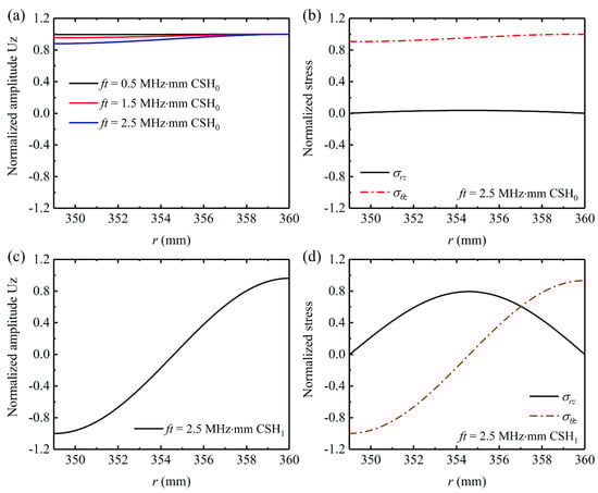 Wave structures and stresses of CSH waves in a steel pipe (outer diameter 720 mm, wall thicknesses 11 mm, Young’s modulus 210 GPa, density 7850 kg/m3 and Poisson’s ratio 0.33): (a) particle displacement distributions of CSH0 wave at different frequencies, (b) stress components and of CSH0 wave at 2.5 MHz·mm, (c) particle displacement distribution, (d) stress components of CSH1 wave at 2.5 MHz·mm.