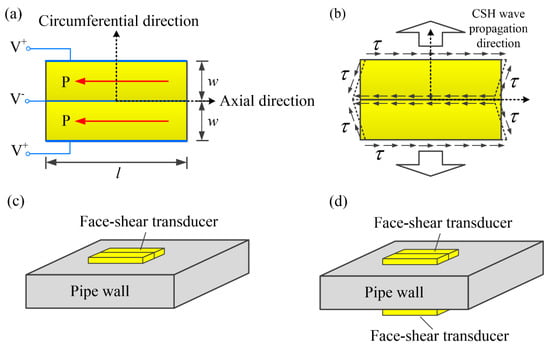 The first step in developing a guided wave transducer is to analyze the wave structures in the waveguide. Figure 3a shows the particle displacement distributions of CSH0 wave in an 11-mm thick steel pipe at different frequencies. For better illustration, the particle displacement distributions are normalized against the maximum displacement of each case. For the CSH0 wave at 0.5 MHz·mm, its particle displacement is uniform across the pipe wall, which is the same as that of a plate-wave solution. Although such a uniform distribution cannot be kept when the frequency increases, the deviation is small and can be neglected especially for the cases below the first cutoff frequency. The quasi-uniform displacement distribution induces that the in-plane shear stress is also almost uniform across the pipe wall as shown in Figure 3b. Moreover, the shear stress of CSH0 wave is negligible. Therefore, the CSH0 wave can be generated by inducing face-shear deformation in the pipe. However, because pure SH0 wave in a plate is generated by the face-shear transducer along four main directions, it can be inferred that a face-shear deformation in the pipe will not only excite CSH wave but also generate axial guided waves. A previously developed bidirectional SH wave piezoelectric transducer [38] may be able to eliminate the possible guided waves propagation in the axial direction of the pipe. As shown in Figure 4a, the bidirectional transducer consists of two identical face-shear d24 PbZr1−xTixO3 (PZT) wafers, which are bonded together via their lateral faces. The two PZT wafers share a same electrode at the bonding interface and their polarization directions (red arrow in Figure 4a) are the same, so the induced face-shear deformations of the two PZT wafers under drive field are opposite. As demonstrated in a recent work [35], the wave field generated by a face-shear transducer is equivalent to that generated by uniform in-plane tractions along its perimeters. Since the induced shear stresses distributed along the PZT wafer edges are symmetric with respect to the axial direction, as shown in Figure 4b, it can be inferred that all the axial guided waves will be suppressed based on the symmetry principle in the theory of elastodynamics. This principle is independent of frequency, so CSH0 wave can be excited over a wide frequency range.