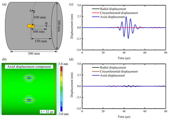 Figure 5b shows the simulated axial displacement wavefield in the 1-mm thick steel pipe excited by the transducer at 0.25 MHz·mm. Based on the wave structure of CSH0 wave shown in Figure 3a, it is known that the axial displacement shown in Figure 5b can represent the CSH0 wave. As expected, the CSH0 wave was excited in both circumferential directions away from the transducer. To further explore the purity of the excited CSH0 wave, the displacements time history at point A and point B were extracted (shown in Figure 5a) and the results were plotted in Figure 5c,d. Figure 5c shows that the obtained circumferential and radial displacement components at point A are zero, indicating that no CLamb waves are generated. Moreover, Figure 5d shows that all the displacement components at point B are almost zero, which means that no axial guided waves are excited. Thus, it can be concluded that pure CSH0 wave was successfully excited by the bidirectional transducer.