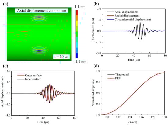 Numerical verification of pure CSH1 wave excitation by a pair of symmetric bonding piezoelectric transducers under out-of-phase excitation at 2.75 MHz·mm in a steel pipe (outer diameter 360 mm, wall thicknesses 11 mm): (a) axial displacement wavefield (CSH1 wave), (b) displacement time history extracted from the outer surface node at the circumferential distance of 30° from the transducer, (c) axial displacement time history extracted from the outer and inner surface nodes at the circumferential distance of 30° from the transducer and (d) comparison of the simulated and theoretically predicted wave structure of CSH1 mode.