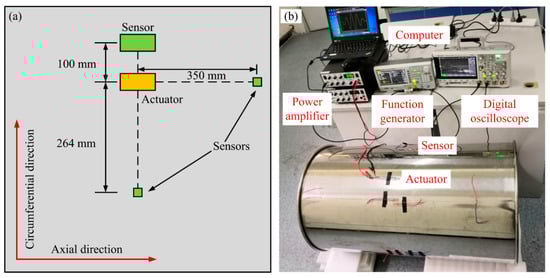 Figure 7 illustrates the experimental setup for exploring the bidirectional piezoelectric transducer’s performance on exciting and receiving CSH0 wave. The bidirectional transducers used in experiments have the same sizes as that used in the finite element simulations in Section 2.