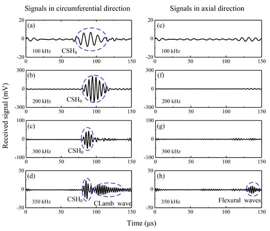 Figure 8 presents the wave signals excited by the bidirectional piezoelectric transducer at different frequencies. Wave signals received by the d36 PMN-PT sensor in the circumferential direction of the pipe are plotted in Figure 8a–d. It was found that pure CSH0 wave was excited over a wide frequency range from 100 kHz to 300 kHz, while CLamb waves were generated at 350 kHz. Correspondingly, Figure 8e–g show that no axial guided waves were generated at the frequency range from 100 kHz to 300 kHz. When the drive frequency increased to 350 kHz, axial guided waves were also excited as shown in Figure 8h. The above phenomenon indicates that the d24 PZT elements used in the bidirectional transducer only exhibit good face-shear performance at the frequency range from 100 kHz to 300 kHz. At this frequency range, the bidirectional transducer can work well as the designed principle introduced in Section 2, so no CLamb waves and axial guided waves are generated. However, when the drive frequency is out of the best working frequency range, the induced deformation of the d24 PZT element is no longer a perfect face-shear deformation, so both CLamb waves and axial guided waves will be excited.