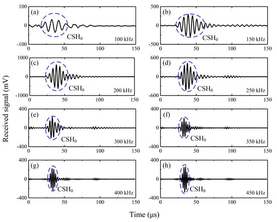Figure 9 presents the wave signals generated by a bidirectional piezoelectric transducer at different frequencies and measured by another identical bidirectional transducer in the circumferential direction. It seems that pure CSH0 wave was excited over a wide frequency range from 100 kHz to 450 kHz. Bearing in mind that Figure 8 shows that the proposed transducer can only excite pure CSH0 wave from 100 kHz to 300 kHz, so Figure 8 and Figure 9 indicate that the bidirectional piezoelectric transducer can also serve as a sensor, which can receive CSH0 wave only by filtering CLamb waves at the frequency range from 100 kHz to 450 kHz. Obviously, the filtering capability is attractive, since it can reduce the complexity of the received signals.