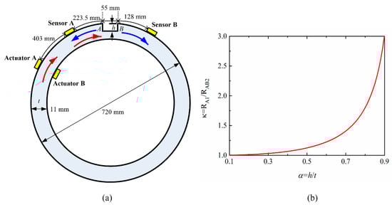 (a) Schematic of the experimental setup for monitoring the corrosion-like defect. (b) Theoretically predicted the change of the amplitude ratio of the two reflected signals versus the relative depth of the notch defect.