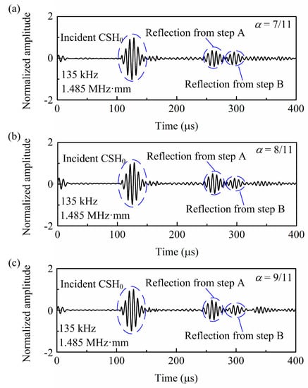 Figure 10b presents the theoretically predicted change of the amplitude ratio versus the relative depth of the notch defect. It can be seen that the amplitude ratio always increases with the increase of relative depth. When the relative depth is smaller than 0.5, the ratio almost keeps constant, indicating that this method is insensitive to shallow defects. However, when the relative depth becomes larger than 0.6, the increase rate of the ratio becomes larger and larger. Therefore, the ratio is a good damage index for deep defects. In order to explore the effectiveness of the proposed method, the shallowest depth of the notch in the experiments is set to be 7 mm. Then the depth of the same notch was machined in 1 mm steps to 8 mm and then to 9 mm. For each case, machining started in the shallowest depth, the measurement experiment was conducted, and then the same notch was remachined to the next depth. In all cases, the incident CSH0 wave was excited by the actuator A at 135 kHz and the reflected signals from the notch were received by the sensor A shown in Figure 10a. For an 11-mm thick steel pipe, 135 kHz is corresponding to 1.485 MHz·mm, which is below the cut off frequency of CSH1 mode, so only CSH0 wave can propagate.
