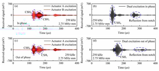 Subsequently, the case where the operating frequency regime is above the CSH1 cutoff frequency is investigated. Note that this discussion is limited to that the pipe thickness only supports CSH0 and CSH1 modes. Figure 12a presents the wave signals generated by a single outer-surface-bonded bidirectional transducer (actuator A shown in Figure 10a) at 250 kHz and received by the sensor A. The corresponding frequency-thickness of 2.75 MHz·mm is above the cutoff frequency of CSH1 mode, so both CSH0 and CSH1 modes are simultaneously excited in the pipe. For comparison, the inter-surface-bonded bidirectional transducer (actuator B shown in Figure 10a) was then energized with the same drive signal used in actuator A. The obtained wave signals are also plotted in Figure 12a. As shown, the CSH0 wave excited by actuator A is almost the same as that generated by actuator B, while the two excited CSH1 modes are out-of-phase. Analogously, if the drive signal for actuator B is antiphase relative to that for actuator A, Figure 12c shows that the CSH0 wave excited by actuator B is also antiphase relative to that generated by actuator A, while the obtained two CSH1 modes are in-phase. This phenomenon is attributed that the wave structure of CSH0 mode is uniform across the thickness of the pipe, while the corresponding distribution of CSH1 mode is antisymmetric across the pipe wall as shown in Figure 3. Therefore, when actuators A and B are energized in-phase, Figure 12b shows that the excited CSH0 wave is significantly enhanced, while the CSH1 wave decreases significantly. By contrast, when actuators A and B are energized out-of-phase, Figure 12d presents that almost pure CSH1 mode is obtained, since the weak CSH0 mode can be neglected. Obviously, these results are in good agreement with the excitation mechanisms proposed in Section 2.