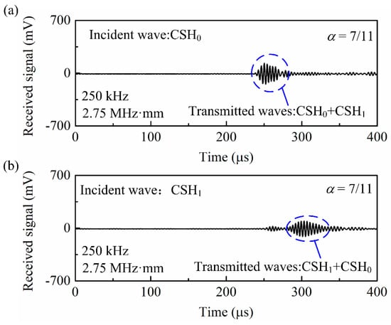 Although pure incident CSH0 wave is generated by using dual excitation, Figure 12b shows that the reflected signals from the notch (depth: 7 mm) are still more complex than that shown in Figure 11a. The reflections contain not only the two reflected CSH0 waves but also the CSH1 mode due to mode conversion. These wave modes overlap in time domain, so the above methods to determine the depth and circumferential extents of the notch become invalid. Therefore, we move to explore the transmission signals. After the incident CSH0 wave passes through a 7-mm deep notch, its transmitted signals are measured by sensor B (shown in Figure 10a) and the results are plotted in Figure 13a. Obviously, both CSH0 and CSH1 modes are generated in the transmitted signals and their waveforms also overlap in the time domain. Similarly, when pure CSH1 mode is excited as the incident wave, the transmitted wave measured by sensor B also contains CSH0 and CSH1 modes as shown in Figure 13b.