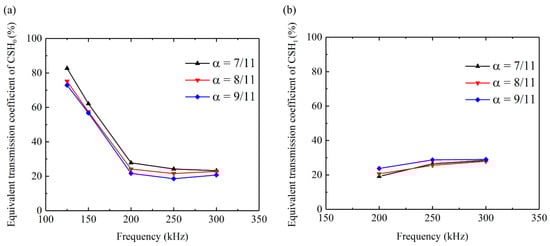 By analyzing the group velocity, it is found that when the incident wave is CSH0 mode, most of the transmitted wave’s energy comes from the CSH0 mode. Analogously, when CSH1 mode is used as incident wave, CSH1 wave is the dominant mode in the transmitted signals. Therefore, by extracting the amplitude of the transmitted signal and combining the incident wave measured by sensor A, the equivalent transmission coefficient can be calculated. By sending pure CSH0 wave at different frequencies, the equivalent transmission coefficients for notches with different depths can be obtained as shown in Figure 14a. It can be seen that the transmission coefficients for all the notches first decrease monotonically with frequency and then keep almost constant after 200 kHz. This phenomenon accords very well with the simulations conducted by Luo, Zhao and Rose [22].