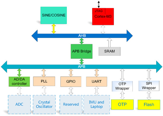 Figure 2 shows the main modules mounted on the bus. Excluding the clock signal from the crystal oscillator, the input signals and output signals of the chip are digital. For modules on the bus, the sine and cosine calculation module, Static Random-Access Memory (SRAM), and the Cortex-M3 processor core are mounted on the AHB. The programs and data during the running of the processor are stored in the SRAM. In the design, the size of an SRAM is 8 KB with a data bit width of 8 bit and a memory depth of 8192. In addition, 16 SRAM are mounted on the AHB, and the total size is 128 KB. All modules mounted on the AHB are frequently accessed, and have faster read and write speeds than modules on the APB.