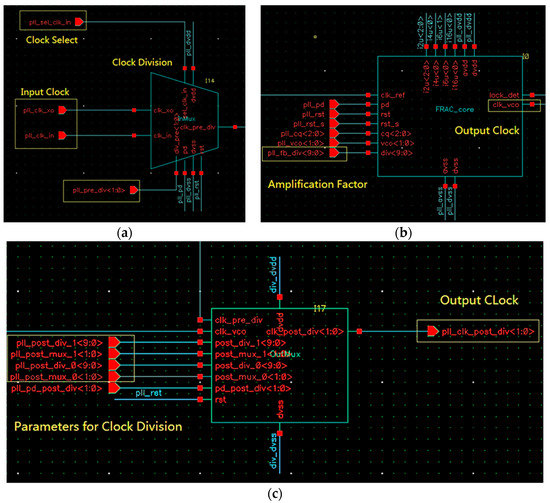 The PLL is a digital-analog mixed module, which converts the output clock of the crystal oscillator to a stable clock signal and the output of a high-frequency clock can be realized [20]. Its schematic diagram is shown in Figure 4. Figure 4a,c shows digital sections for implementing parameter configuration of the PLL, and Figure 4b shows an analog section for outputting a high-frequency clock.