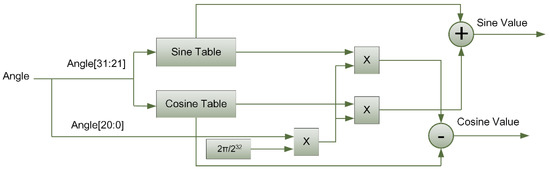 Equation (3) is the principle on which sine and cosine calculations are based. The calculation of and uses the look-up table method. Since is 11 bits, a sine lookup table of size bits and a cosine lookup table of the same size are established. The calculation of and is based on linear interpolation of the values obtained by the lookup tables.
